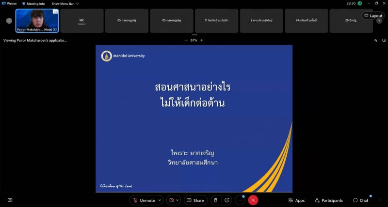 วันที่ 9 ตุลาคม 2565 เวลา 13.00-15.00 น. วิทยาลัยศาสนศึกษา มหาวิทยาลัยมหิดล จัดอบรมคุณครูแนะแนว และคุณครูที่สนใจในหัวข้อ “สอนศาสนาอย่างไร ไม่ให้เด็กต่อต้าน” เพื่อพูดคุยให้ความรู้ ทำความเข้าใจ รวมถึงแนะนำเทคนิค การเปลี่ยนบทบาทของคุณครูในการจัดการเรียนการสอนด้านศาสนาเพื่อให้เข้าใจเด็กมากยิ่งขึ้น