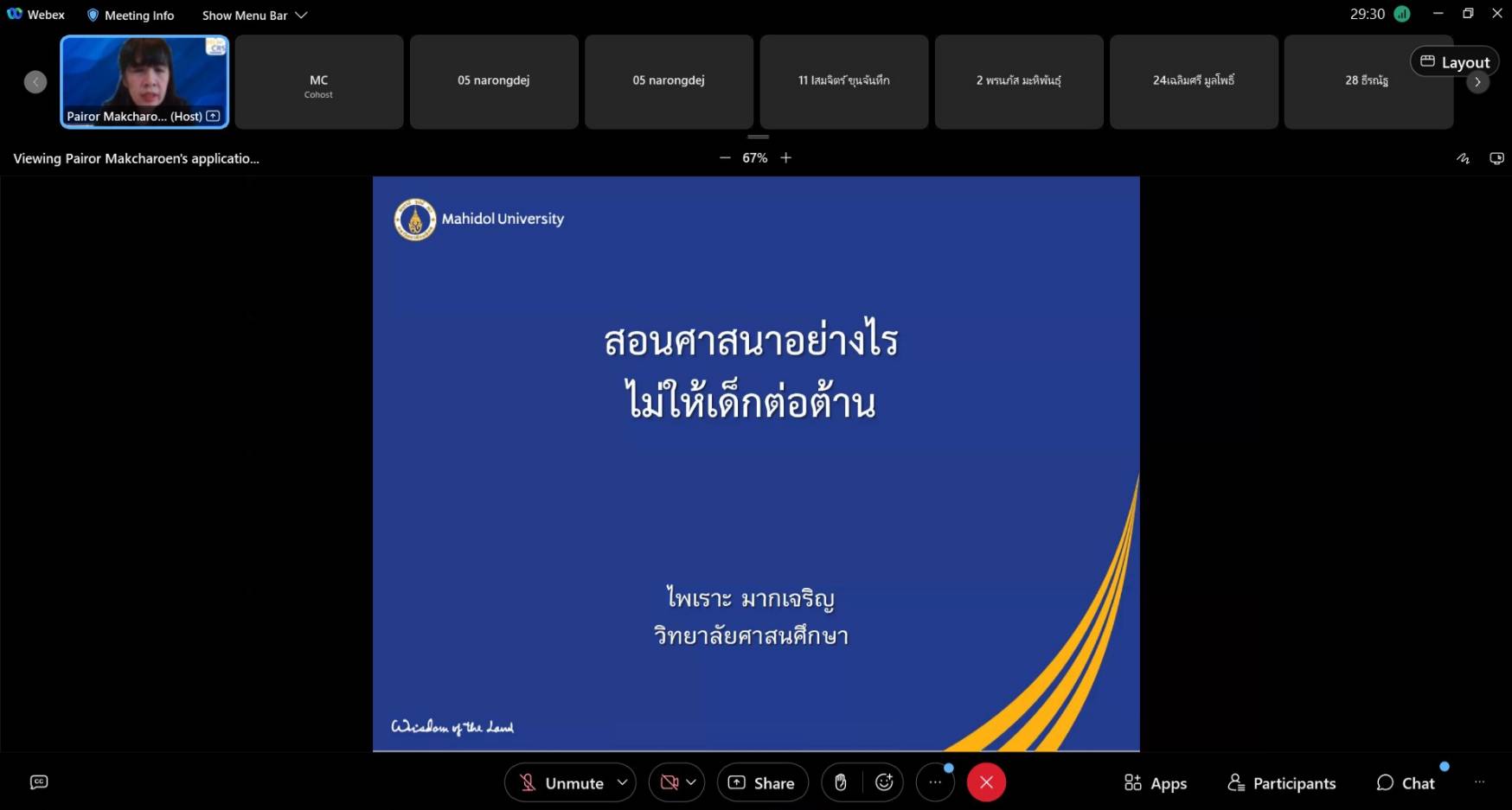 วันที่ 9 ตุลาคม 2565 เวลา 13.00-15.00 น. วิทยาลัยศาสนศึกษา มหาวิทยาลัยมหิดล จัดอบรมคุณครูแนะแนว และคุณครูที่สนใจในหัวข้อ “สอนศาสนาอย่างไร ไม่ให้เด็กต่อต้าน” เพื่อพูดคุยให้ความรู้ ทำความเข้าใจ รวมถึงแนะนำเทคนิค การเปลี่ยนบทบาทของคุณครูในการจัดการเรียนการสอนด้านศาสนาเพื่อให้เข้าใจเด็กมากยิ่งขึ้น